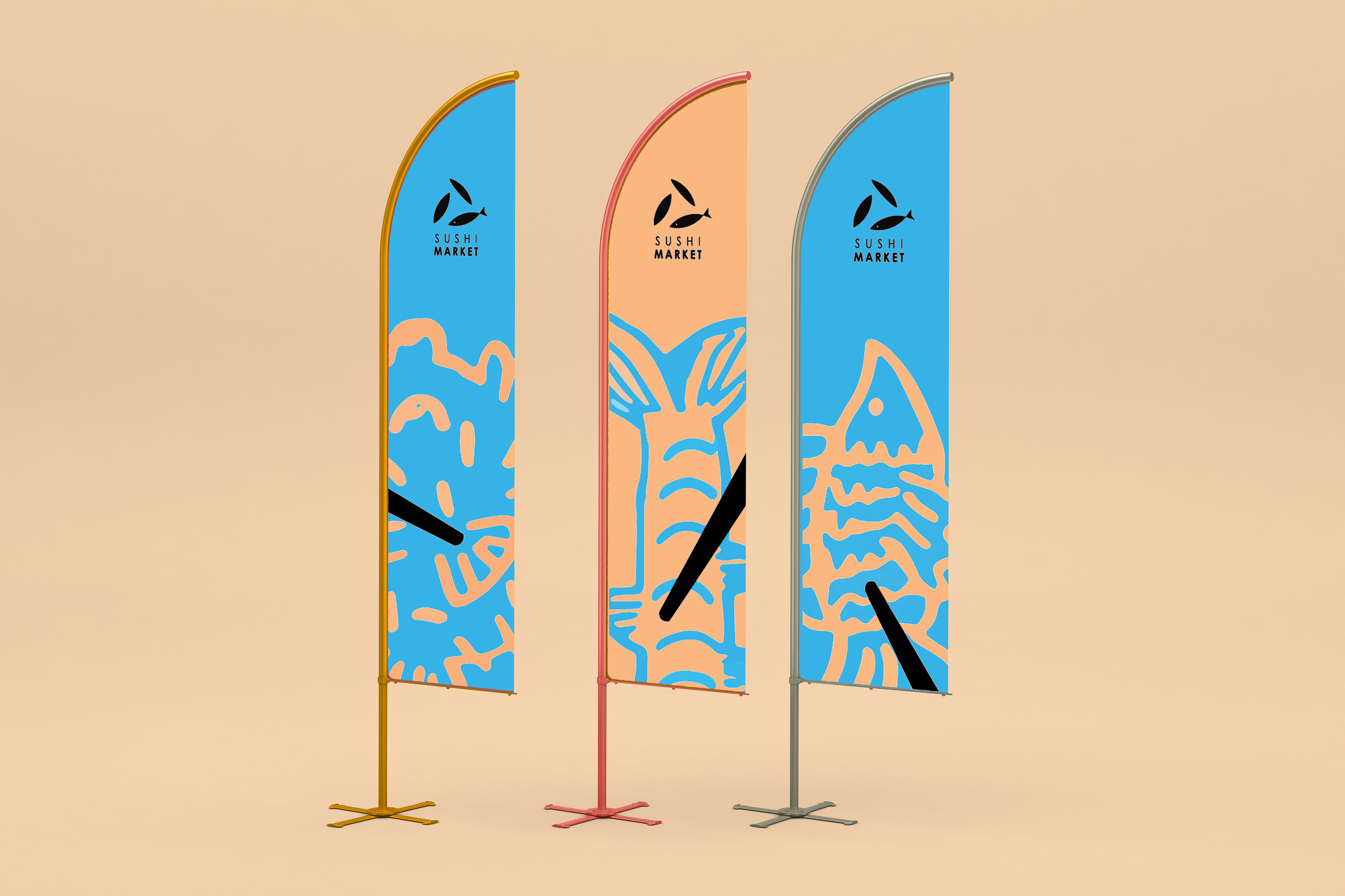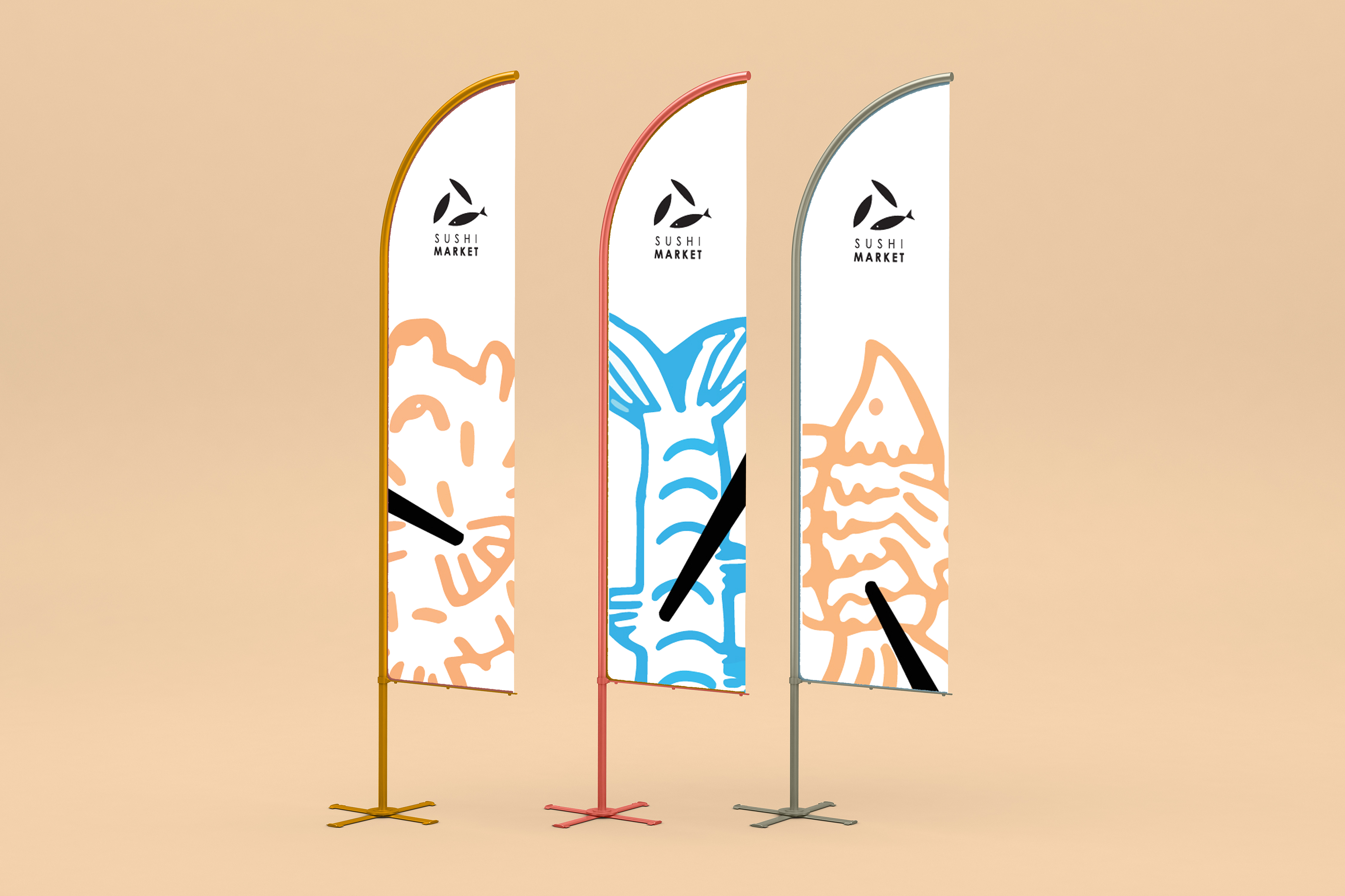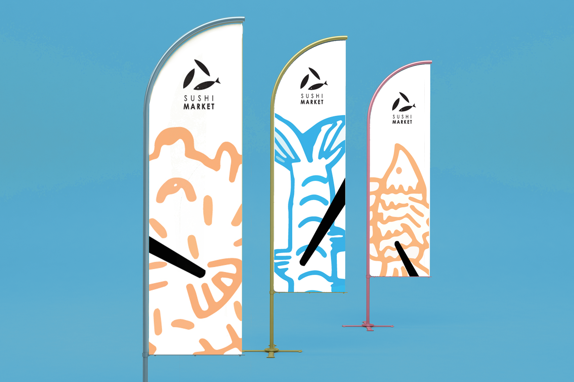 Brand identity for Sushi Market includes logo, papers, stuff t-shirts, advertising flags.