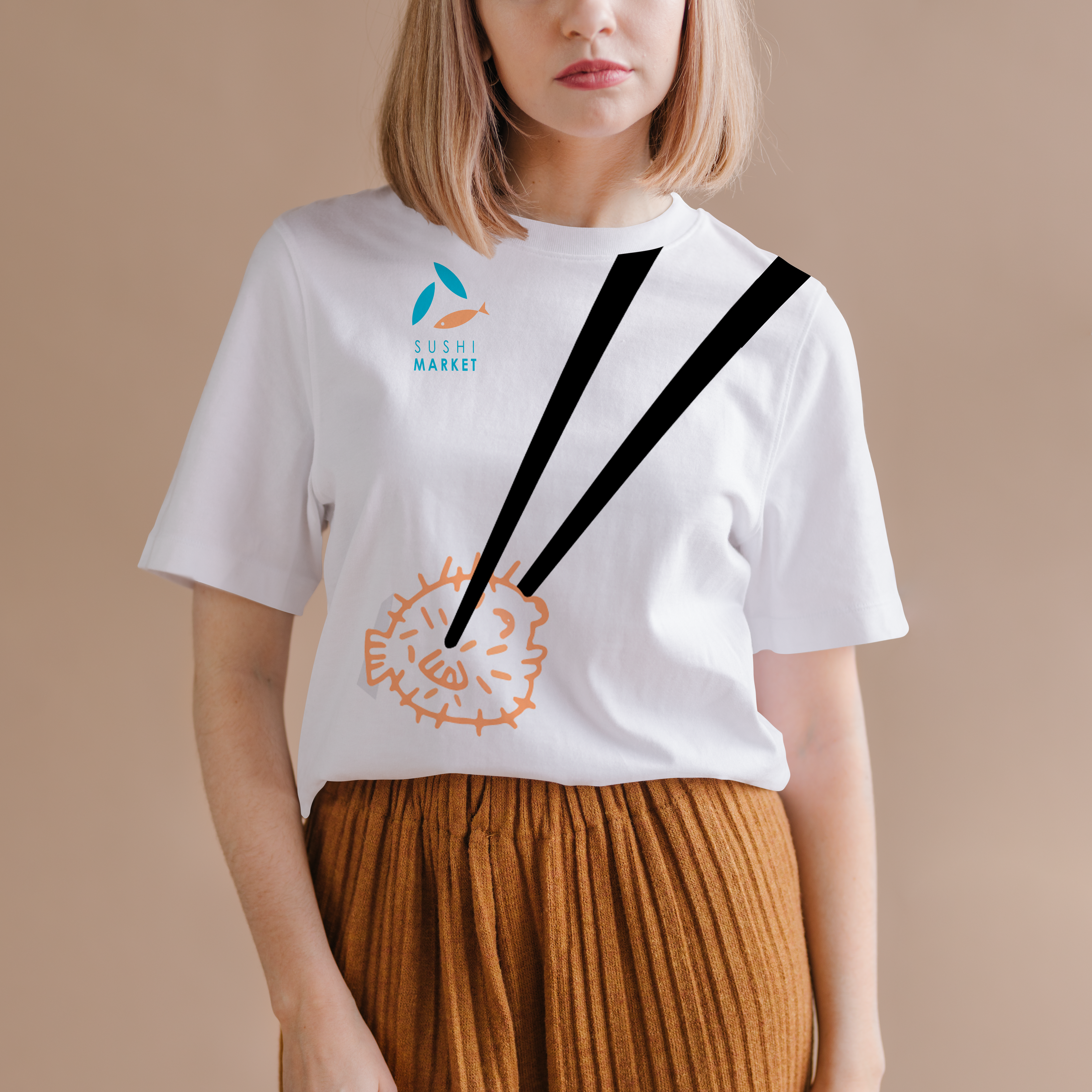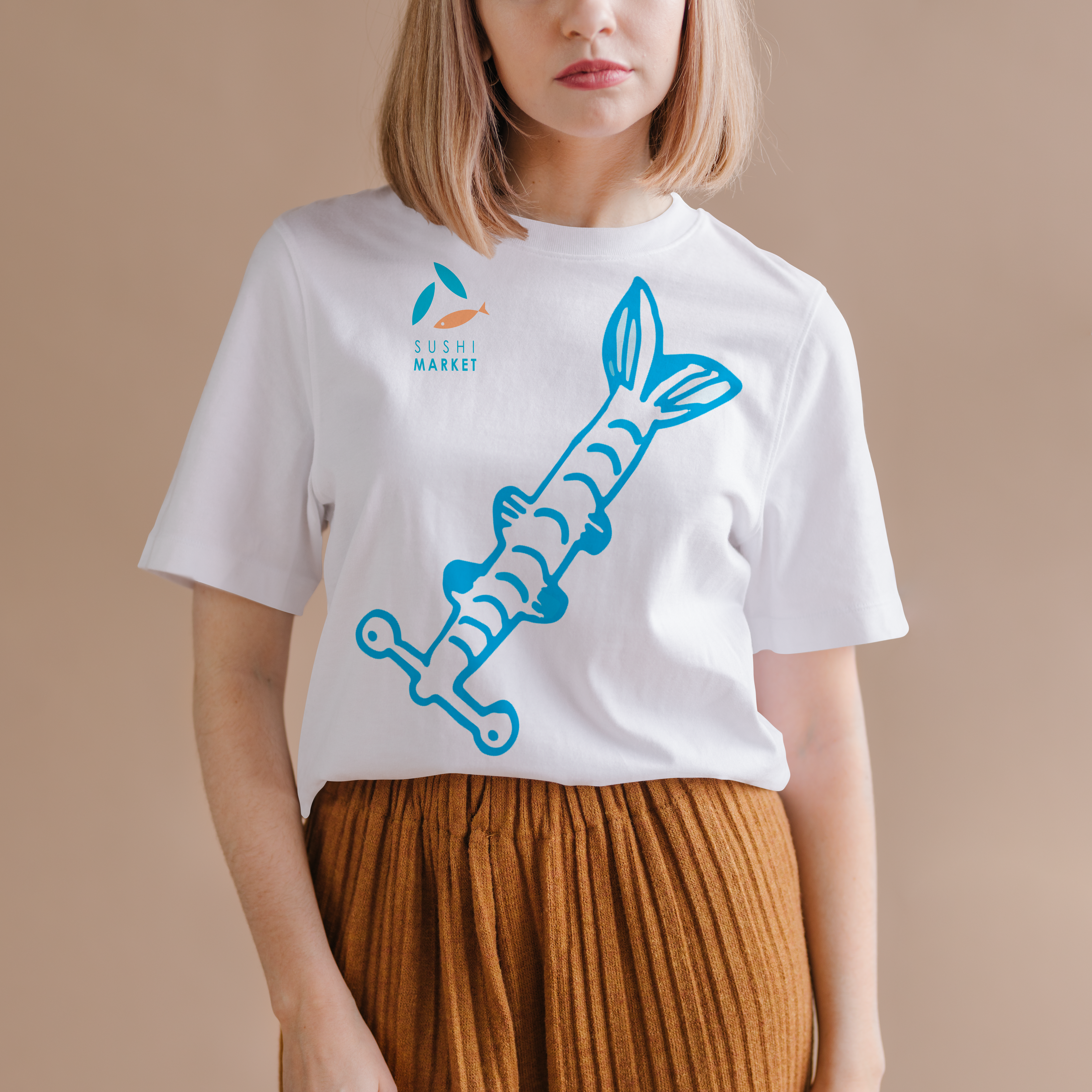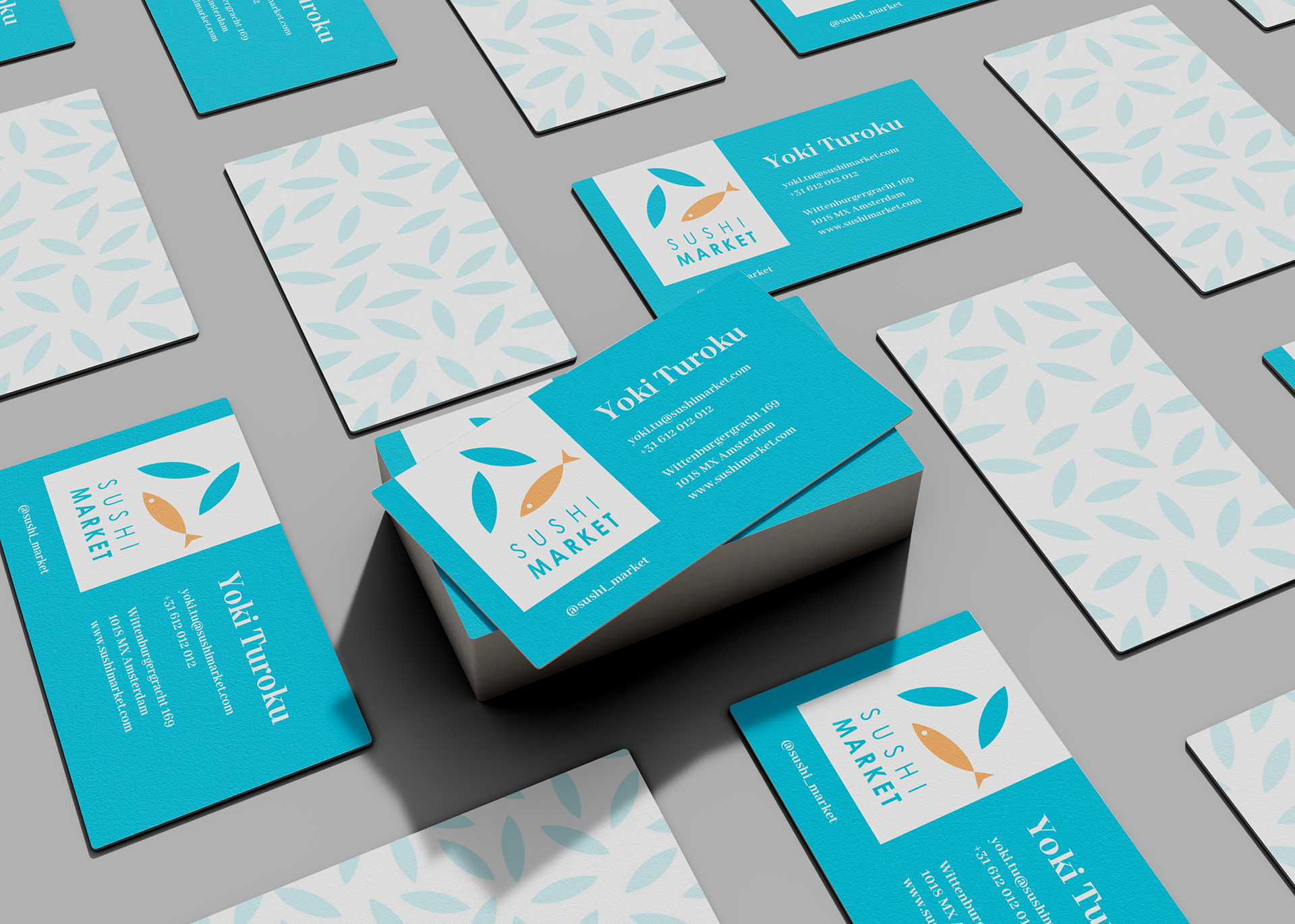 Brand identity for Sushi Market includes logo, papers, stuff t-shirts, advertising flags.